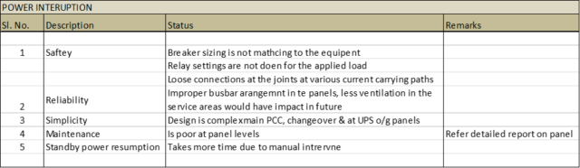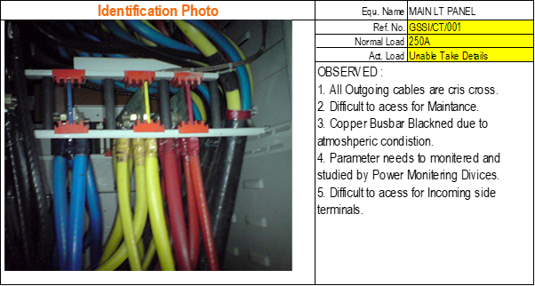 We could conduct thermography test for various panels, apart form keeping power analyser in the system for 7 days to monitor the status of all the electrical panels and found that none of the panels are in satisfactory condition in terms of temperature limits, protection settings etc.,
